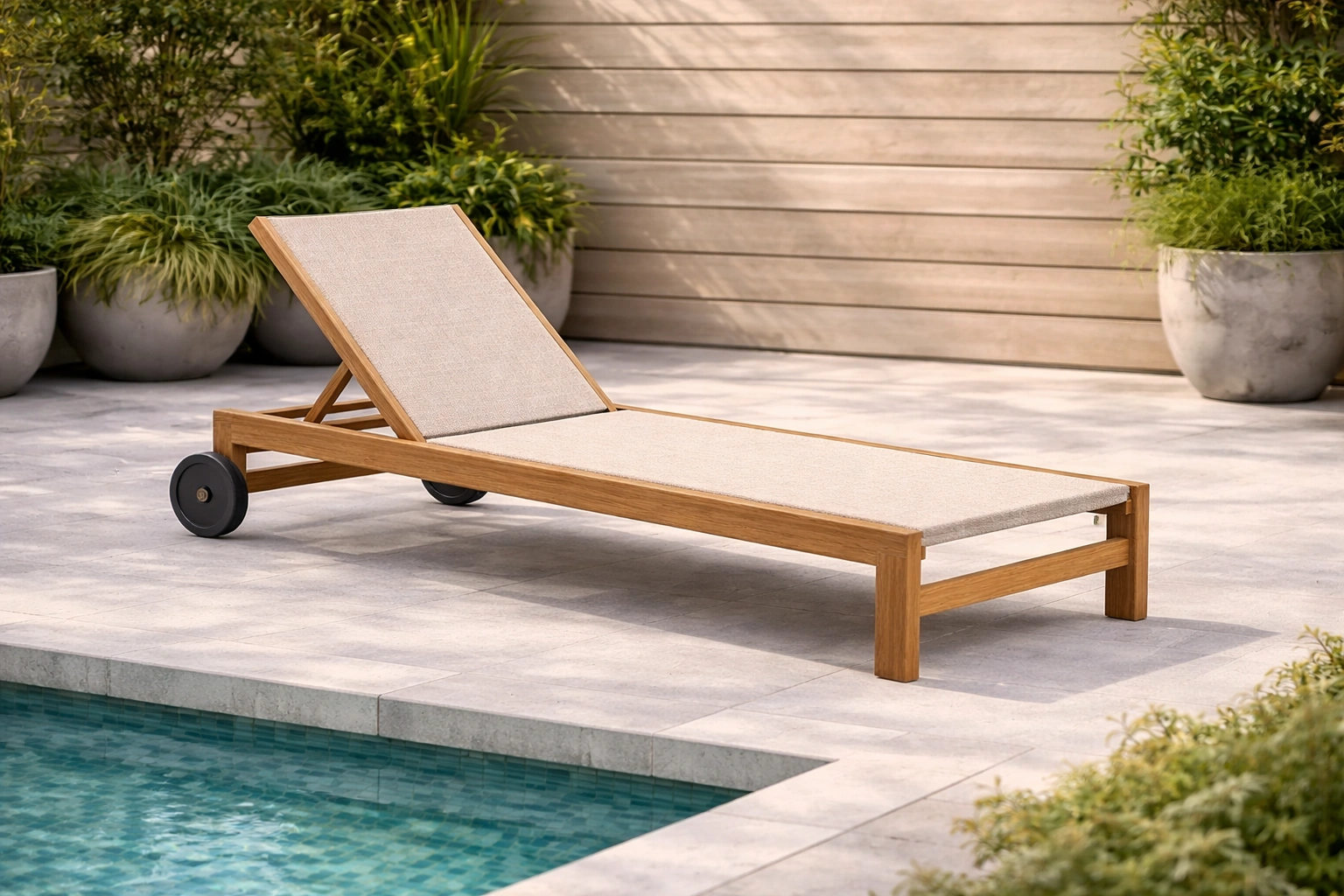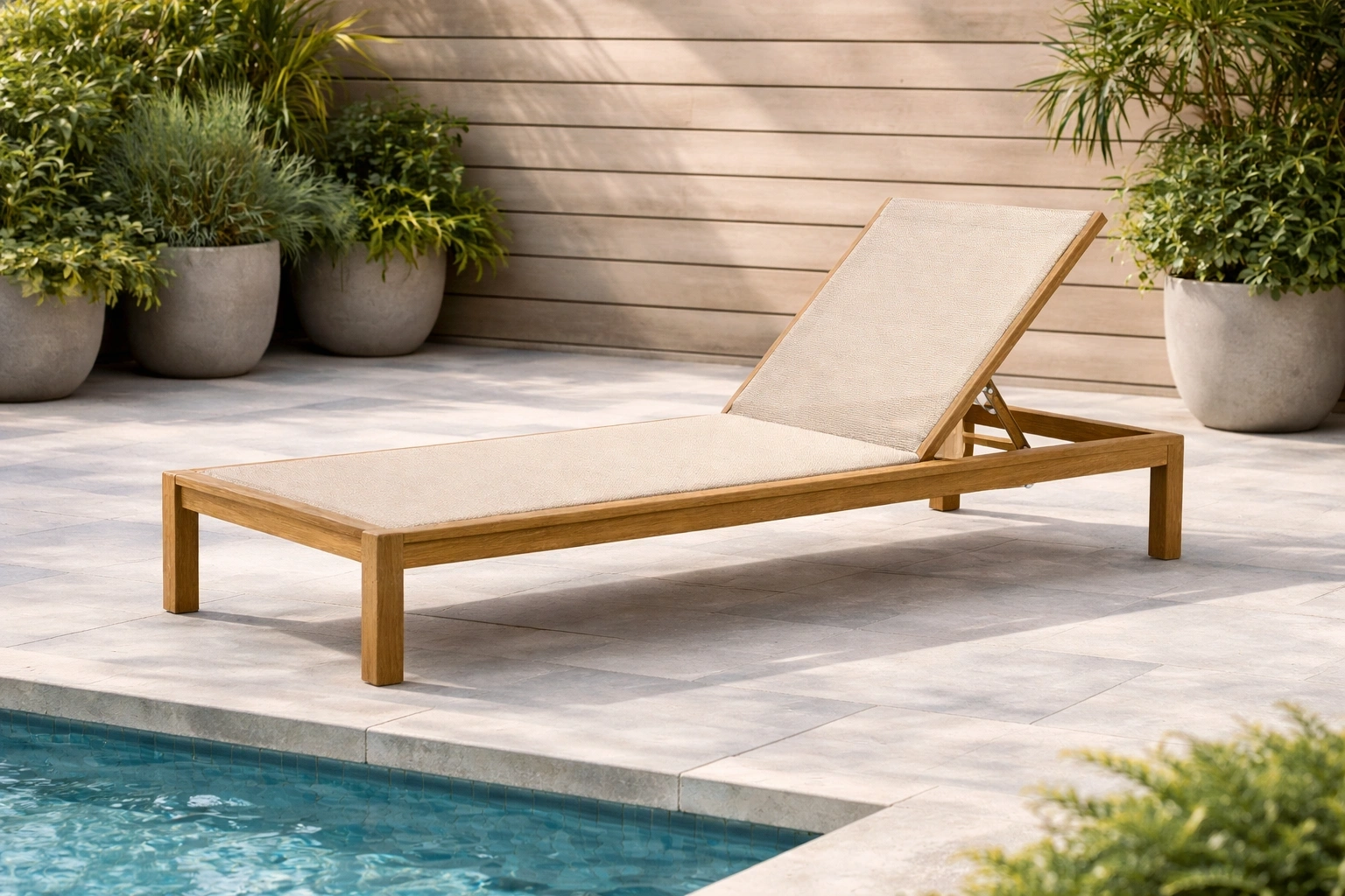 Chaise longue en teck et textilène réglable beige