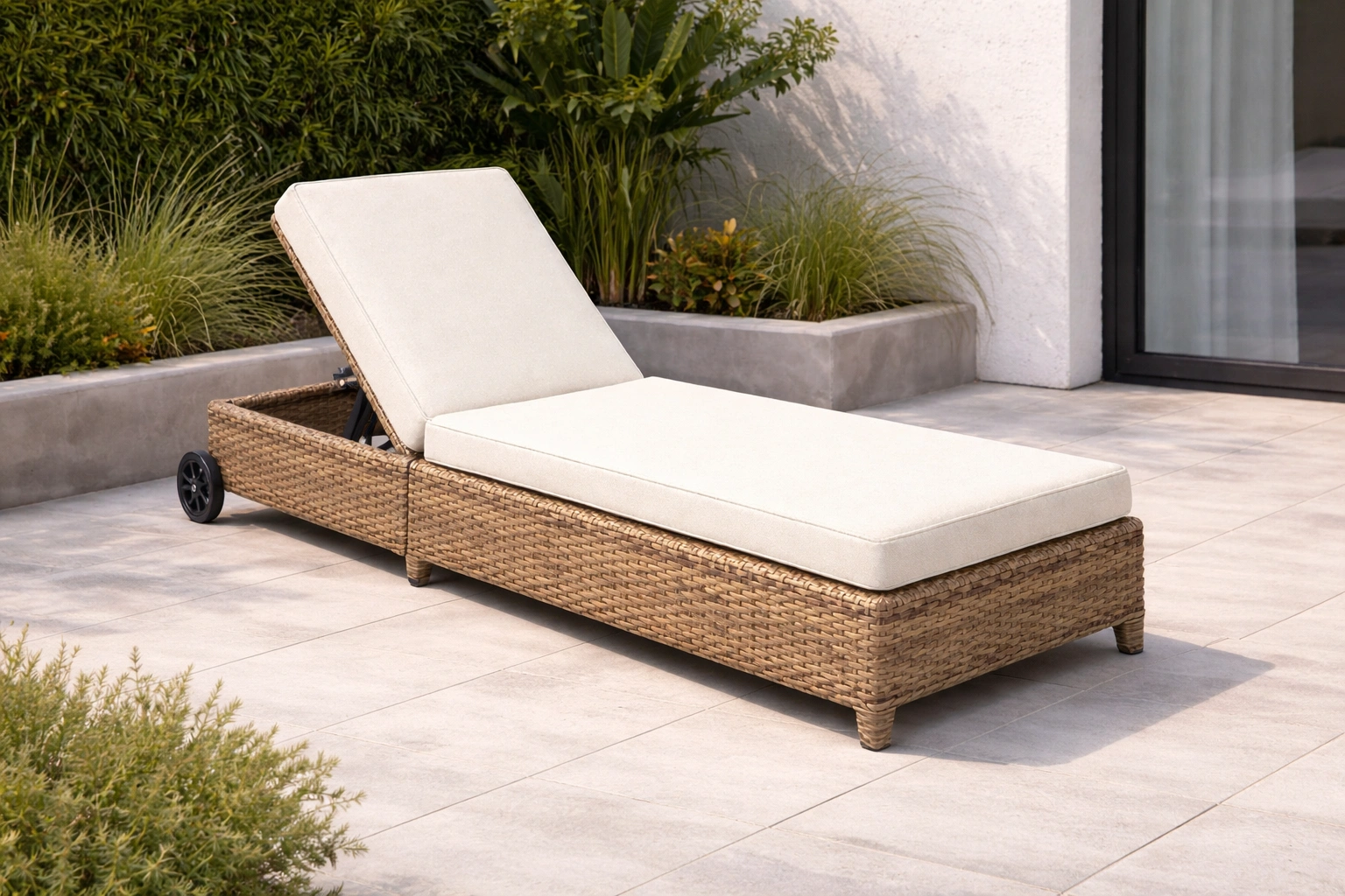 Chaise longue en résine tressée beige avec coussin réglable